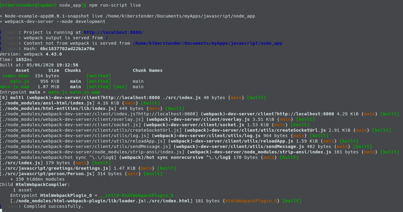 npm install --save-dev webpack-dev-server@3.10.3Isso é um servidor simples que executa sua aplicação em Hot/Live-reload, assim toda vez que você salvar um arquivo, Webpack irá detectar se há alguma mudança e se houver, recompilar aquele arquivo para você sem parar a aplicação intenria por causa de uma mudançca. PS: Hot/Live-Reload é apenas para proprósitos de desenvolvimento, NÃO USE EM PRODUÇÃO. Ele é lento e não uglifica seu código tornando fácil para pessoas não autorizadas lê- lo ou depurá- lo.
