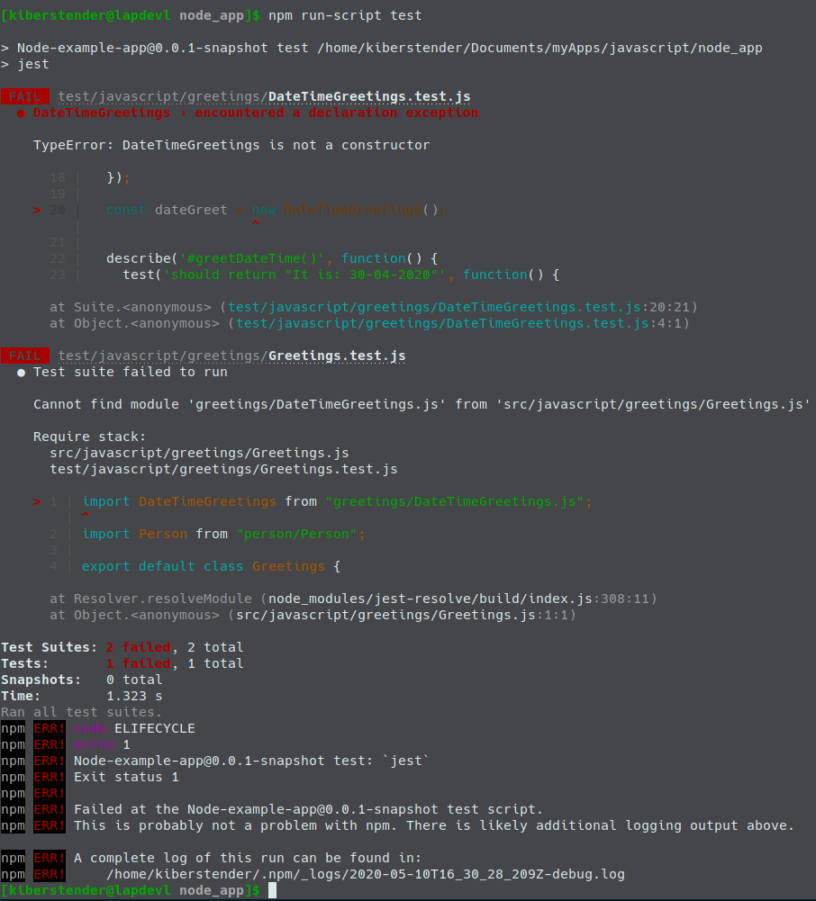 Se você tentou executar nossos velhos testes, você viu que temos um problema agora. Nós mudamos da antiga síntaxe require/module.exports em nossos arquivos Greeting.js/DateTimeGreetings.js para usar a síntaxe import/export mas não em nossos testes: