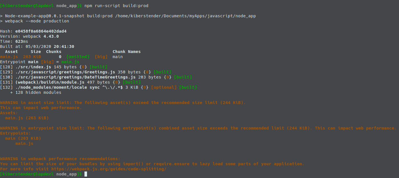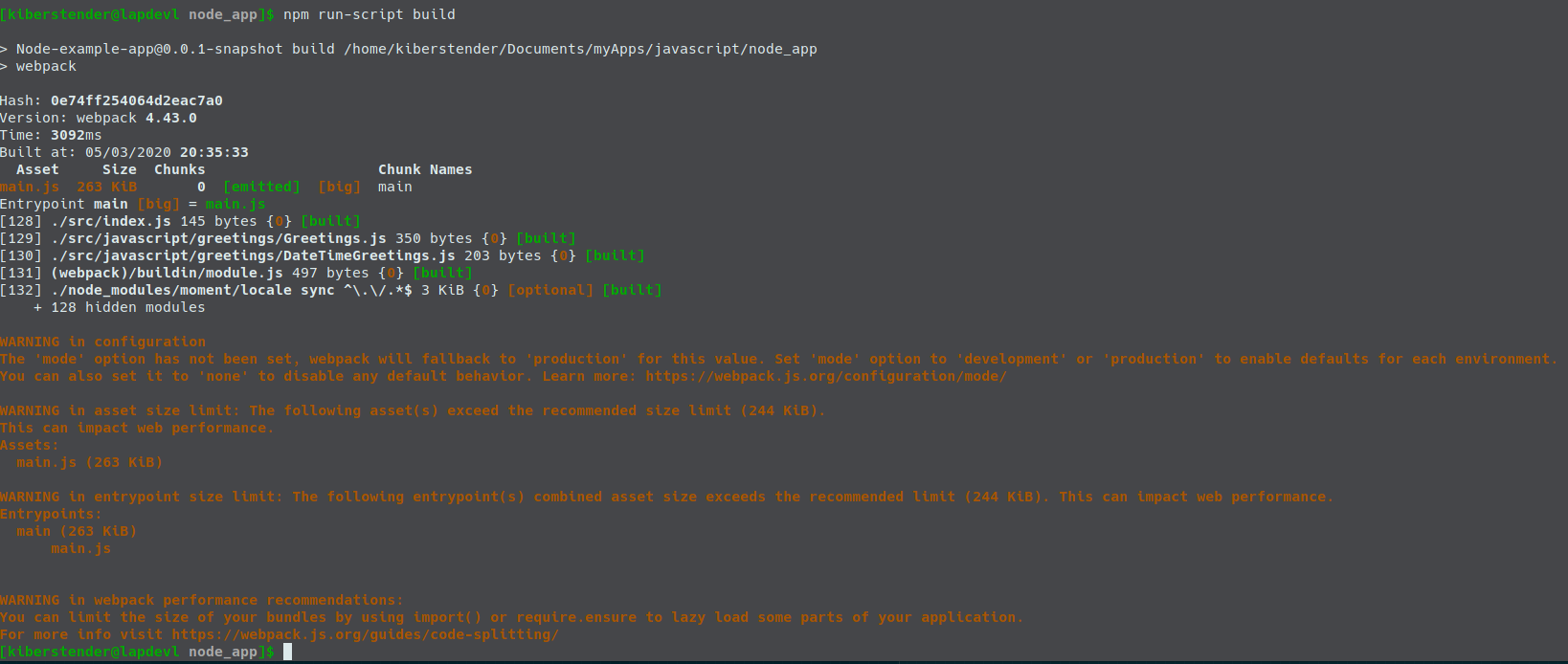 WARNING in configuration: Este aviso está aqui porque, como mencionei no ínicio, Webpack possui suporte para ambientes de produção e desenvolvimento, logo quando você não especifica qual ambiente você está usando, Webpack ativa o modo de produção e emite um aviso para que você saiba que você precisa especificar as informações faltantes. Você pode modificar sua seçãoscriptsempackage.json, ao editarbuilde adicionar o novobuild:prod:... "scripts": { ... "build": "webpack --mode development", "build:prod": "webpack --mode production", ... } ...WARNING in asset/entrypoint/webpack performance: Estes avisos estão aqui porque o Webpack é mais focado em melhorias de aplicação de frontend. Assim para fazer o frontend carregar mais rapidamente seus arquivos, eles devem ser menores que 244 Kib, Por isso ele te aponta duas possíveis soluções: usar a síntaxeimport/exportou usar as dicas de https://webpack.js.org/guides/code-splitting/. Isto é somente para performance da aplicação, pois quanto menores os bundles mais rápidos eles são baixados e usando carregamento preguiçoso(lazy loading) os arquivos não serão carregados na memória a menos que seja necessário. Este é um tópico muito avançado e deve ser coberto em uma postagem dedicada